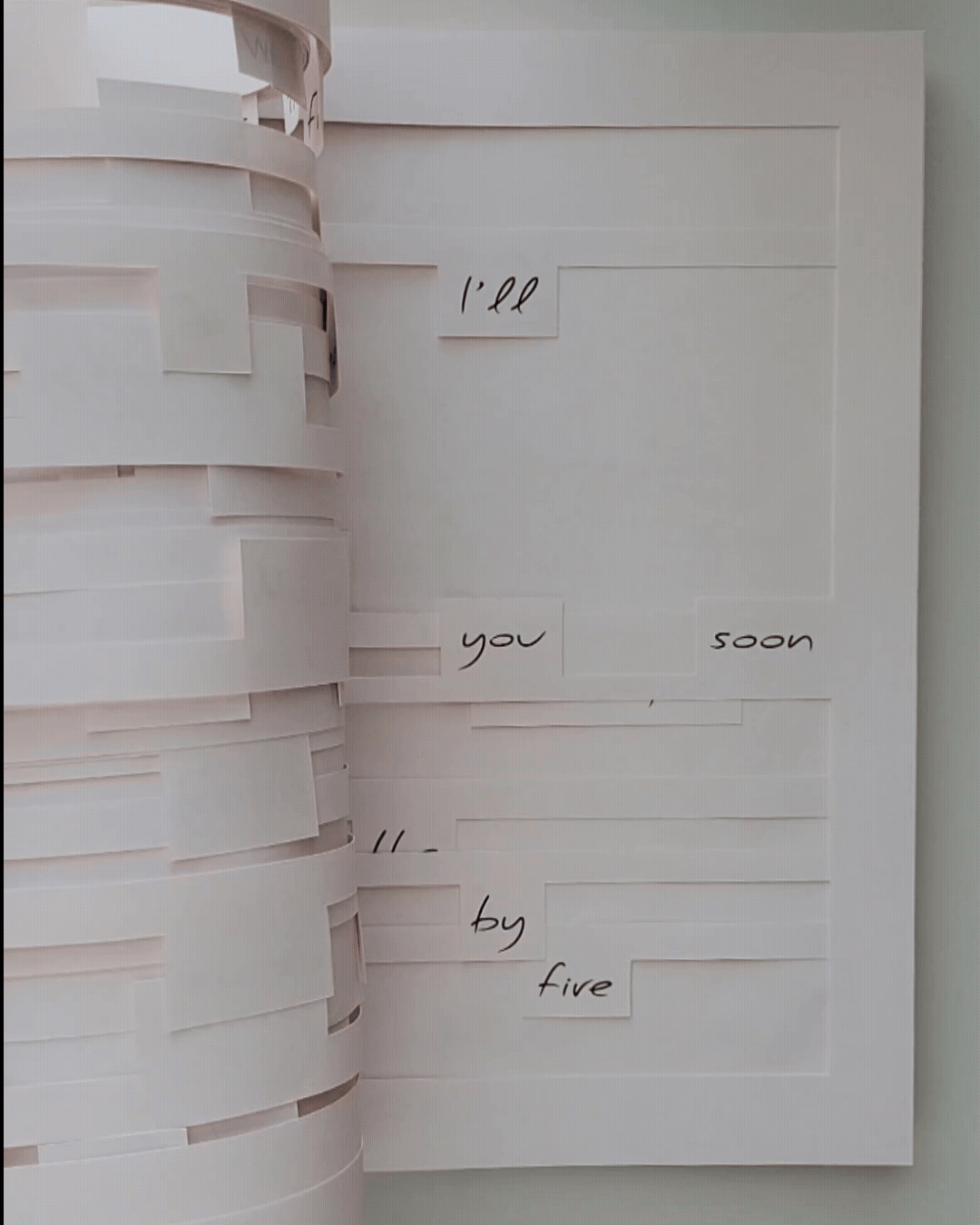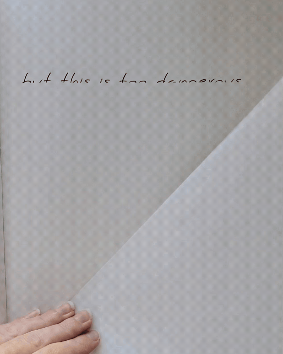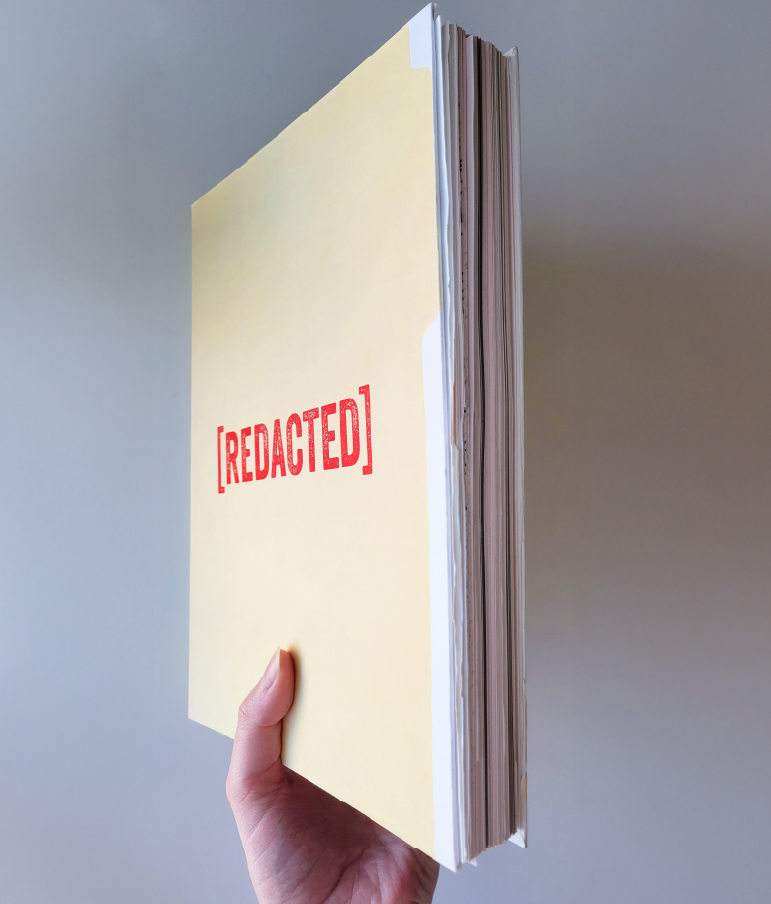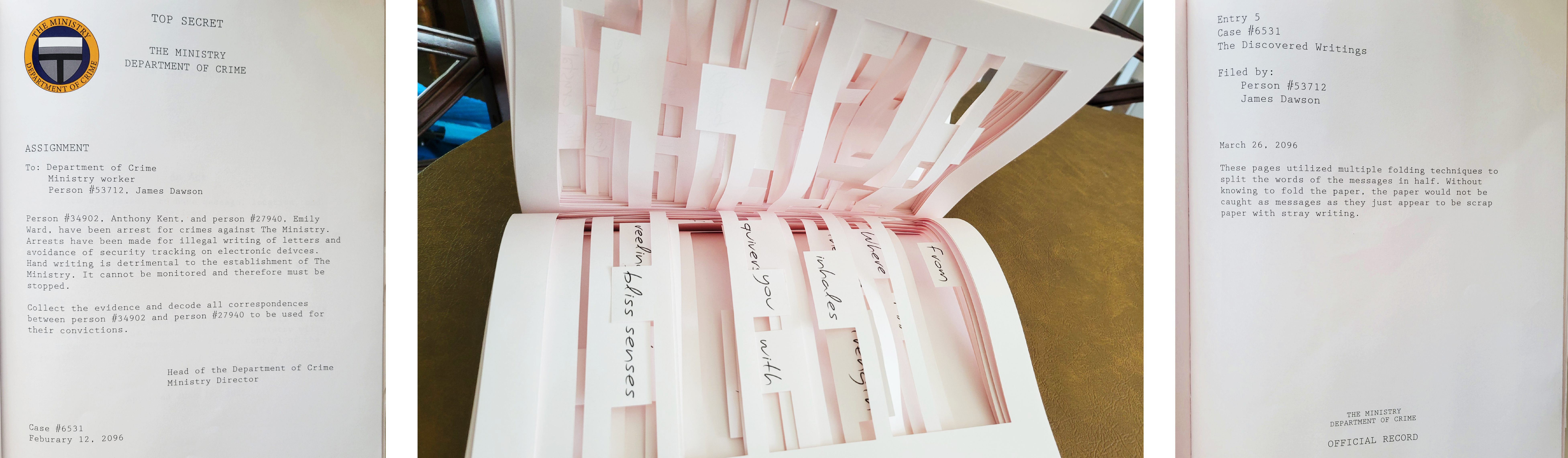 A 500-page speculative design book was conceived, written, and produced to explore a dystopian future defined by pervasive data surveillance. Drawing on themes from blackout and redaction poetry, as well as the authoritarian undertones of 1984, the project imagines a world where handwritten communication is outlawed for its resistance to government tracking. The narrative unfolds through illegal love letters exchanged between two characters, later confiscated and archived as evidence. Their messages are encoded through physical interventions such as page folding, hole cutouts, transparent overlays, and layered compositions. These letters interspersed with governmental documents provide context on the violated statutes and the methods used to decipher each communication. The resulting “artifact” displays narrative world-building with physical experimentation, creating an immersive and unsettling vision of a future where privacy itself becomes contraband.